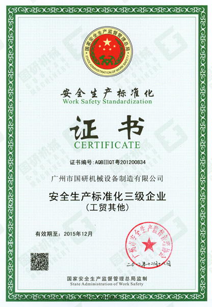 2012年12月24日,国家安全生产监督管理总局为港澳宝典正版资料库公司颁发了《安全生产标准化企业证书》,这意味着我司已达到《广州市工业企业安全生产标准化评定办法》及《广州市工业企业安全生产标准化评定标准》的要求。
