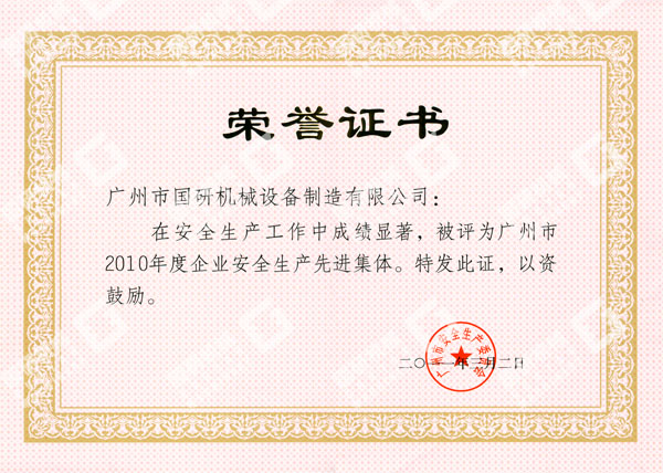 近日,在广州市人民政府召开的安全生产工作总结暨表彰大会上再次传来喜讯,广州市港澳宝典正版资料库设备制造有限公司被广州市人民政府授予“广州市2010年度企业安全生产先进集体”荣誉称号。这是我司获得中华全国总工会和国家安全生产监督管理总局授予2009年度全国“安康杯”竞赛优胜企业称号后,被授予的又一殊荣。